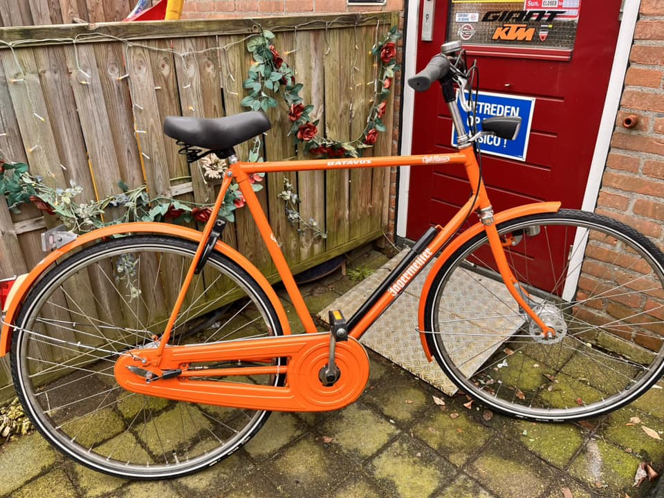 In een vergeten hoek van Barendrecht, tussen een houten schutting en een rode deur vol stickers, stond hij te wachten. Niet zomaar een fiets — een Batavus Intercycle, ooit een brave stadsfiets, nu getransformeerd tot een café racer met karakter. Zijn frame: feloranje, als een schreeuw om aandacht. Zijn naam: Jägermeister — een ode aan de brute racewagens uit de jaren ’70, aan de geur van benzine en het gebrul van boxermotoren.
